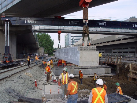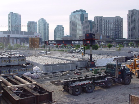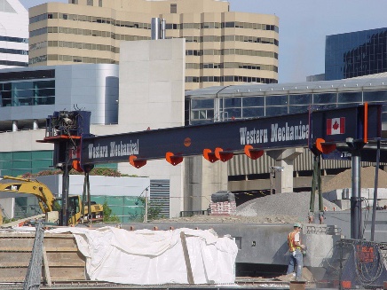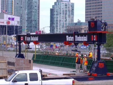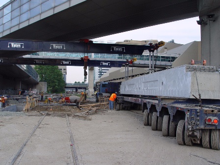 During the second phase of this project, Western continued to complete the Simcoe Street Tunnel by installing the new concrete girders, which were originally fabricated in the fall of 2006. The girders were loaded using a 44A hydraulic gantry at the splice bed where they were fabricated and transported uphill to a modified 48A – 800 ton Gantry. The girders were transported using a multi-axle trailer, which greatly increased the versatility of the transporter in such a tight and crowded site. As the girders arrived under the gantry, they were lifted and placed on the respective bearing pads.